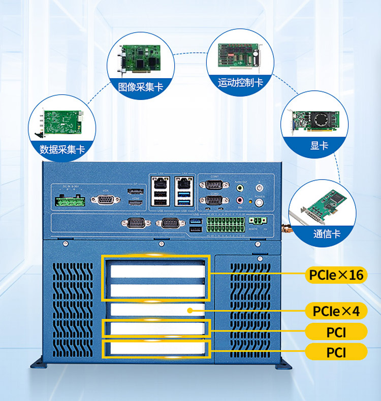 四卡槽版搭載1*PCIe X16、1*PCIe X4、2*32bit PCI共四個(gè)擴(kuò)展插槽,支持高速GPU、圖像采集卡、運(yùn)動(dòng)控制卡、AI加速等功能配置,可增強(qiáng)特定工業(yè)應(yīng)用的硬件拓展和功能定制彈性。