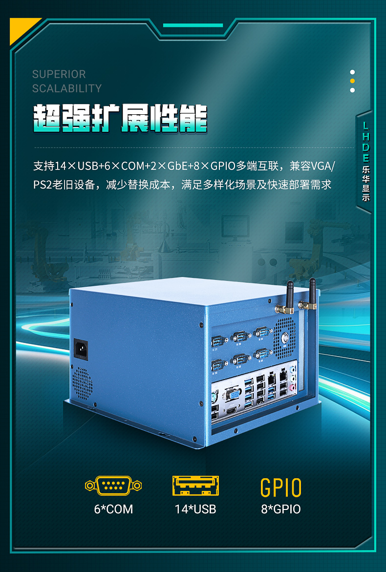 接口部分支持14×USB+6×COM+2×GbE+8×GPIO多端互聯(lián),兼容VGA/PS2老舊設(shè)備,滿足多樣化場景及快速部署需求。